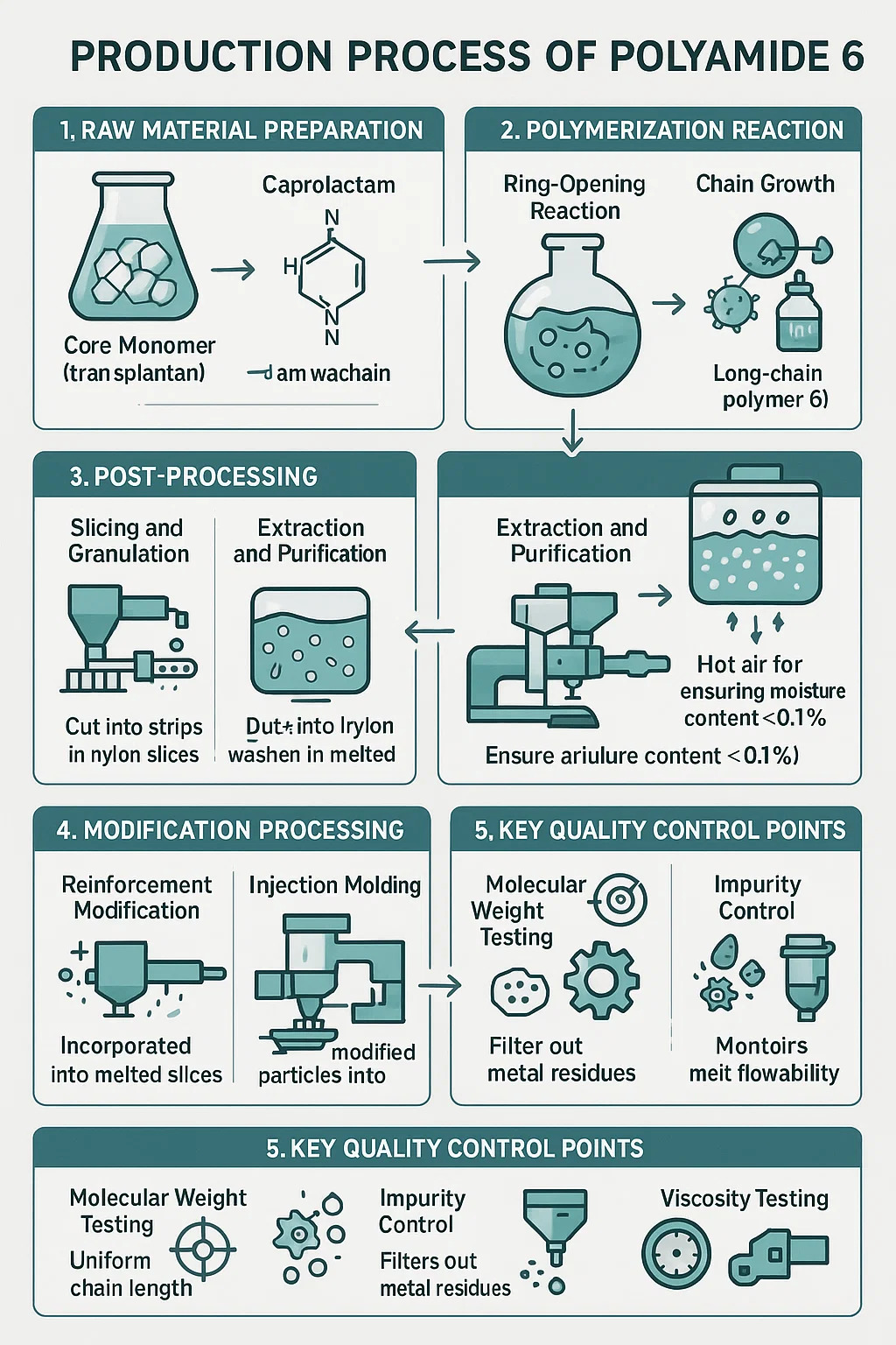 Monômero Central: Caprolactama (um cristal transparente), produzido a partir do benzeno extraído do petróleo por meio de uma reação em múltiplas etapas.