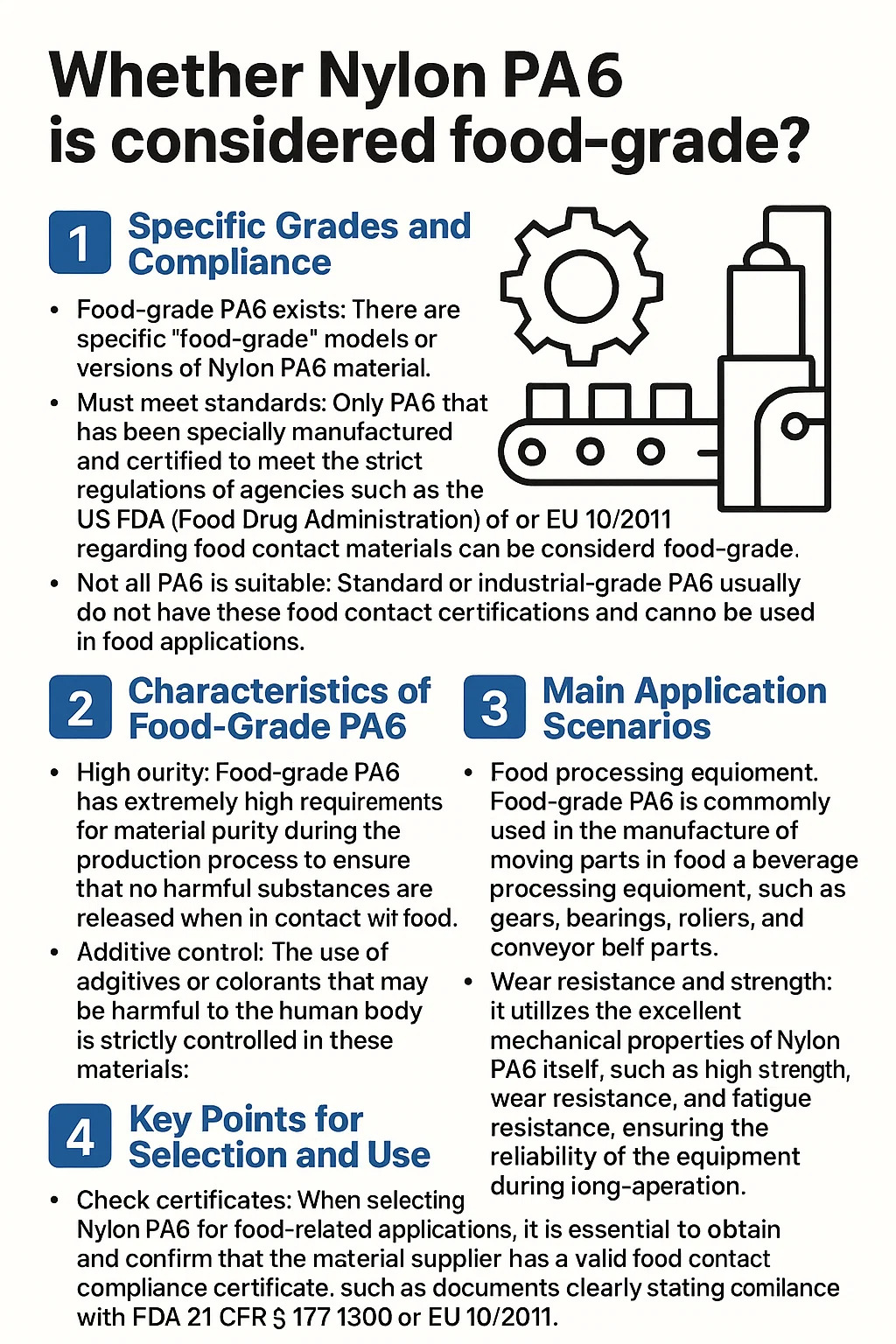 Nem todo PA6 é adequado: o PA6 padrão ou de nível industrial geralmente não possui essas certificações de contato com alimentos e não pode ser usado em aplicações alimentícias.