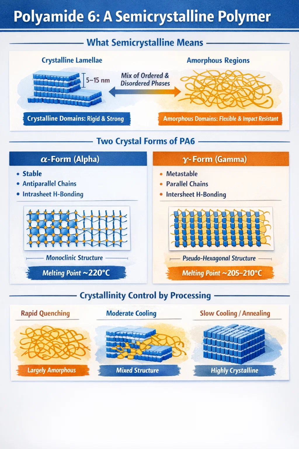 Um equívoco comum é que o PA6 é “cristalino” ou “amorfo”, dependendo de como é processado. Na realidade, a proporção de cada fase muda com as condições de processamento, histórico térmico e teor de umidade - mas ambas as fases estão sempre presentes até certo ponto na Poliamida 6 sólida. O PA6 resfriado por têmpera pode ter um índice de cristalinidade tão baixo quanto alguns por cento, enquanto o material resfriado lentamente ou recozido pode atingir cerca de 35%. Nenhum dos extremos produz um material que seja puramente uma fase ou outra.