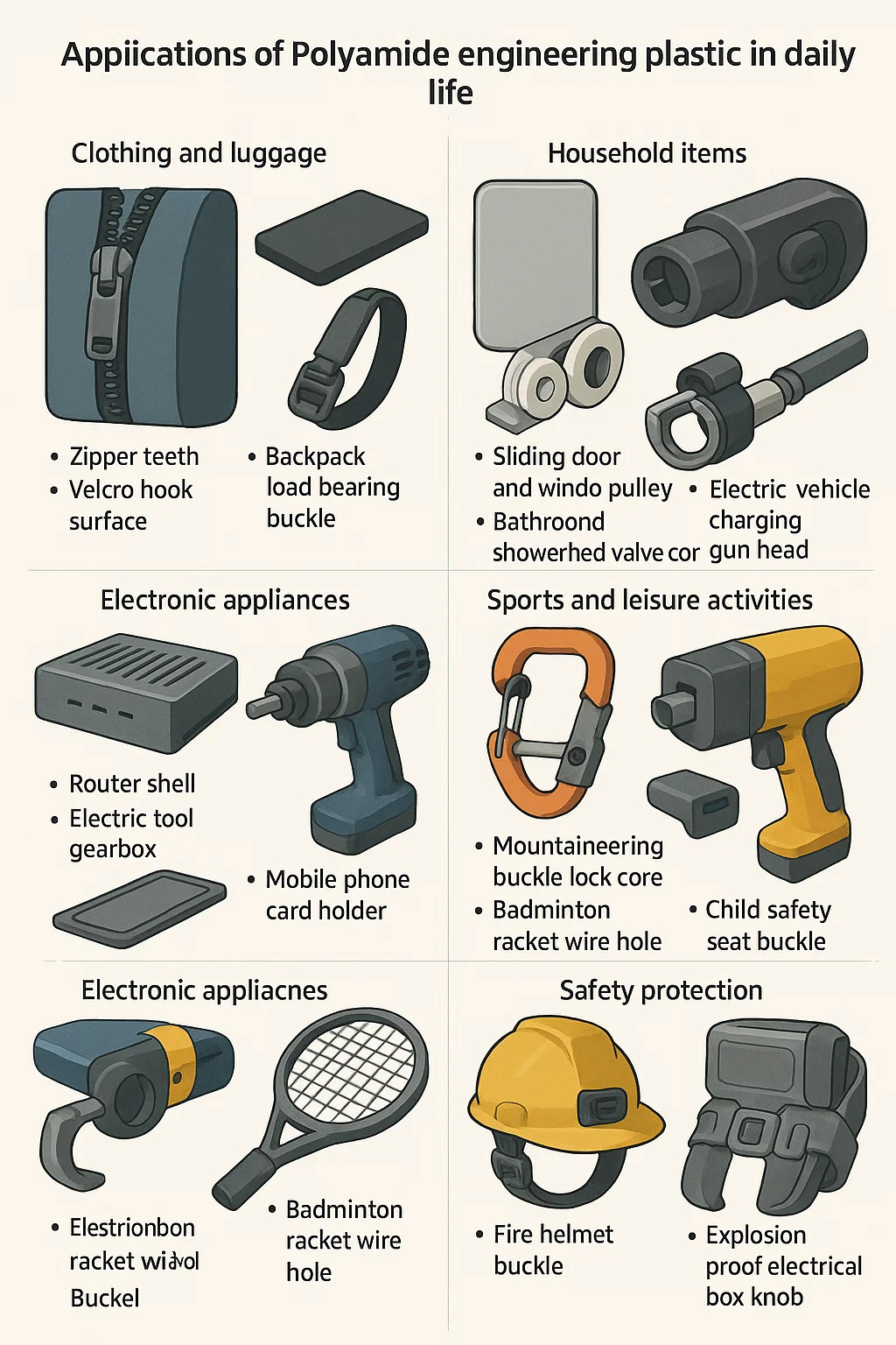 A aplicação de Engenharia de poliamida plástica Na vida cotidiana, permeia vários campos, e seu valor central está nas características de substituir aço por plástico e ser leve e durável. Cenários típicos específicos são os seguintes: