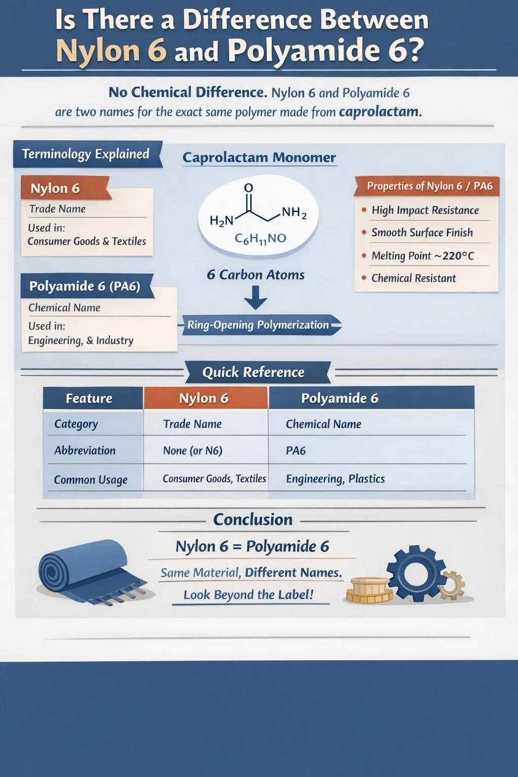 Para simplificar: não há diferença química entre o Náilon 6 e a Poliamida 6. São dois nomes diferentes para exatamente o mesmo polímero. "Nylon" é o nome comercial conhecido ouiginalmente cunhado pela DuPont, enquanto "Poliamida" é o nome químico formal usado na ciência e na engenharia. Quando você vê Náilon 6 no rótulo de um produto de consumo e Poliamida 6 em uma ficha técnica, referem-se ao mesmo material feito de monômeros de caprolactamaa.