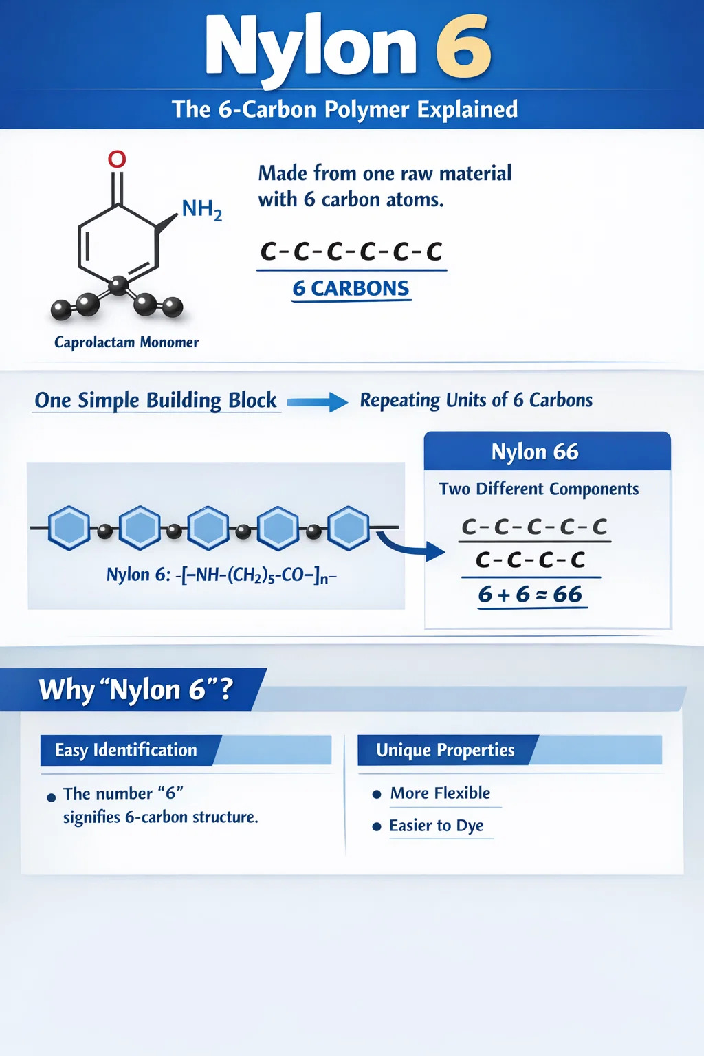 Lógica de nomenclatura: Como apenas esses 6 átomos de carbono estão envolvidos na construção de toda a cadeia longa, por conveniência e facilidade de memorização, cientistas e fabricantes simplesmente o chamaram de “Nylon 6”.